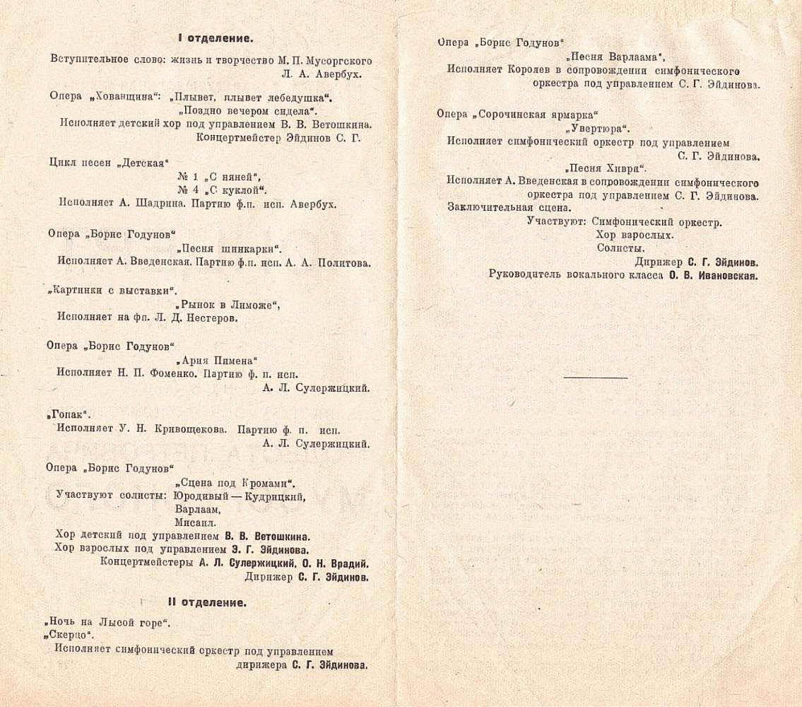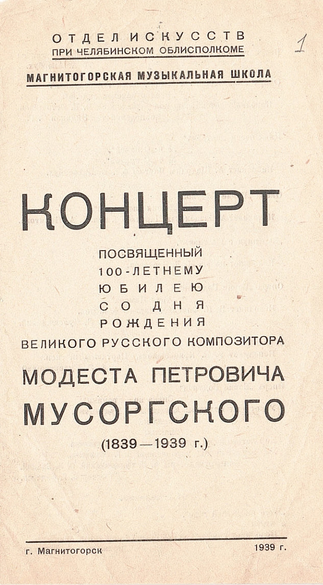 «…Магнитогорская музыкальная школа и училище должны стать той кузницей музыкальных кадров, в которых уже сейчас ощущается острый недостаток, стать городским музыкальным центром, через который широкие слои трудящихся города Магнитогорска должны будут познакомиться с гениями музыкальной культуры и подготовить базу для создания в городе к концу 3 пятилетки своего кадрового – оперного театра и симфонического оркестра» - отчетный доклад С.Г.Эйдинова 1939 год.