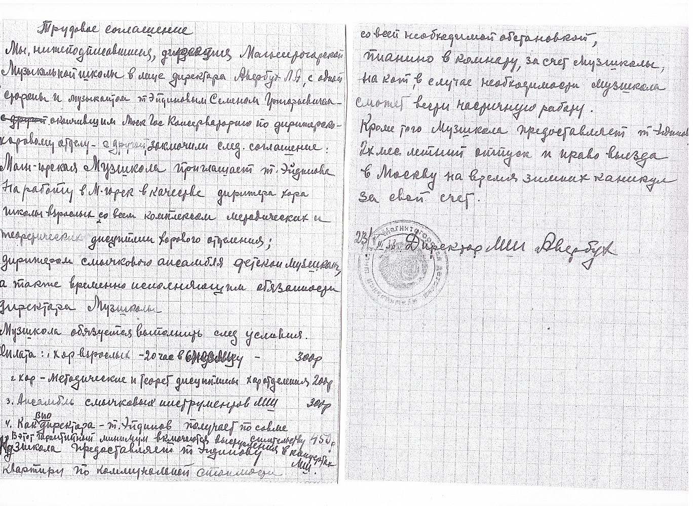 Трудовое соглашение между дирекцией музыкальной школы и Эйдиновым С.Г. (ф.461, д. 19, л. 1).