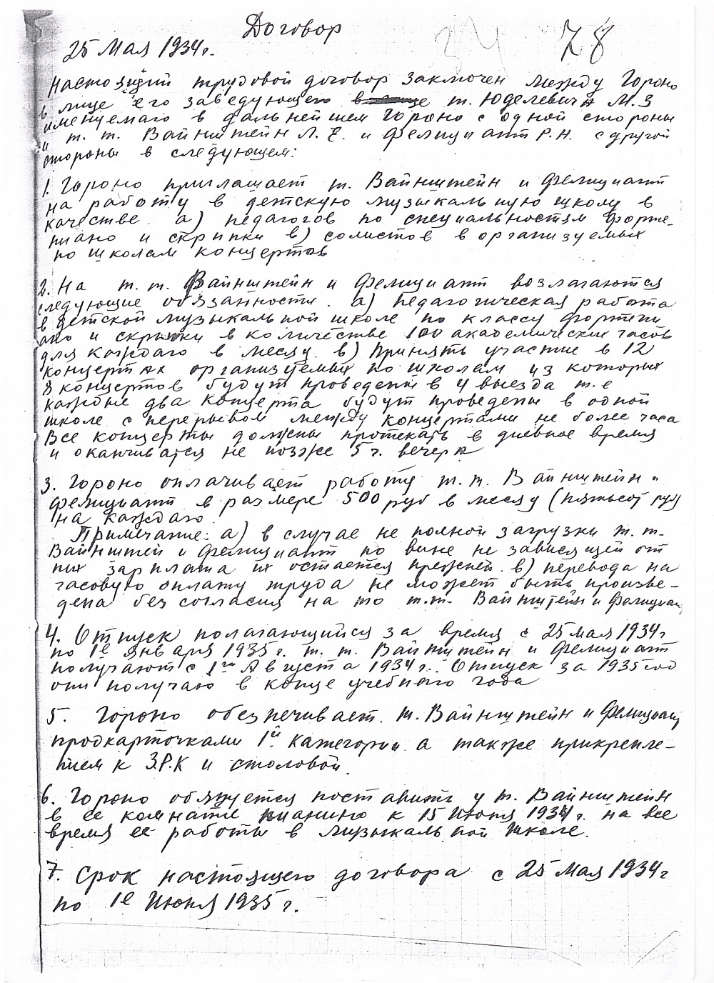 Трудовой договор педагогов музыкантов с заведующей ГОРОНО (ф. 12, оп. 1, д. 5, л. 34).